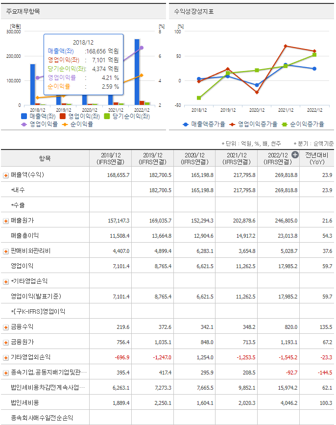-2023년 3월 전년동기 대비 연결기준 매출액은 0.1% 증가, 영업이익은 4.6% 감소, 당기순이익은 3.7% 감소. 러-우 전쟁 장기화, 전세계적 인플레이션, 미 금리인상 등의 불확실성이 상존하고 있으나, 주요국들의 경기부양책에 힘입어 교역량이 회복이 되면, 트레이딩에 대한 수요가 늘어날 것으로 전망됨. 전기차 수요 증가에 따른 북미 현지 생산 확대 및 동남아 신규 생산공장 가동으로 CKD사업의 시장전망은 양호한 상태임.