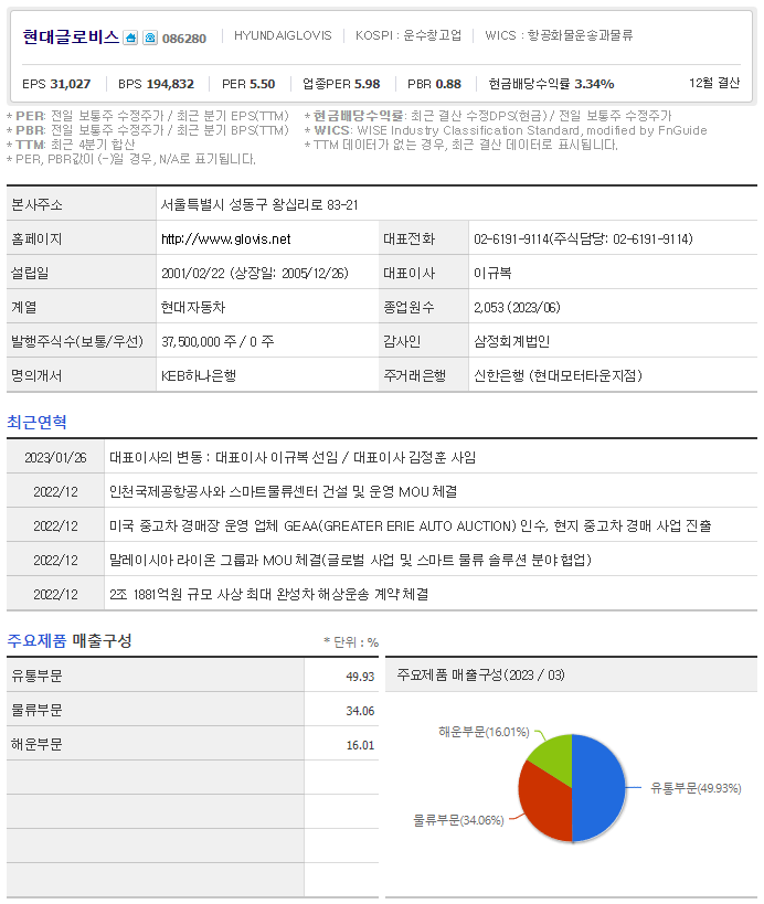 현대글로비스는 육상운수 기업입니다. 대표자는 이규복 이며 설립일은 2001/02/22, 주식 상장일은 2005/12/26입니다. 전체 종업원 수는2,053명 이고 본사 주소는 서울특별시 성동구 왕십리로 83-21입니다.
