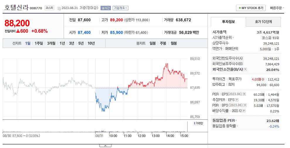 호텔신라 현재 주가는 87,600원이며 전일 대비 원의 모습을 보이고 있습니다. 호텔신라의 주주현황을 살펴보면 삼성생명보험(외 5인)이 지분 17.34%를 소유하고 있습니다. 호텔신라는 도소매 기업으로 장중 기준으로 주가는 87,600원 입니다. 삼성전자의 시가 총액은 3조4499억 원이며 발행 주식수는 20.04주 입니다. 외국인 보유 비중은 413,453% 이며 장중 거래량은 39,248,121를 기록했습니다. 매출액은 16,191억 원, 영업이익은 783억 원을 달성했습니다. EPS는 4,570원이며 호텔신라 주식 배당수익률은 2.22% 입니다.