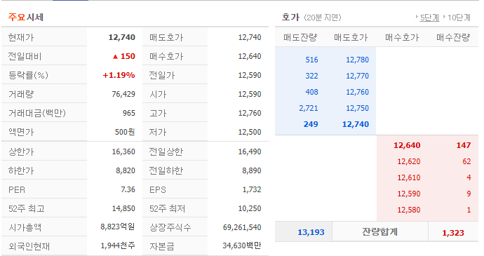 한일시멘트 현재 주가는 12,590원이며 전일 대비 -100원의 모습을 보이고 있습니다. 한일시멘트의 주주현황을 살펴보면 한일홀딩스(외 9인)이 지분 73.12%를 소유하고 있습니다. 한일시멘트는 건축소재 기업으로 장중 기준으로 주가는 12,590원 입니다. 시가 총액은 8824억 원이며 발행 주식수는 2.81주 입니다. 외국인 보유 비중은 39,709% 이며 장중 거래량은 69,261,540를 기록했습니다. 매출액은 8,812억 원, 영업이익은 1,180억 원을 달성했습니다. EPS는 1,400원이며 한일시멘트 주식 배당수익률은 20,125,554% 입니다.