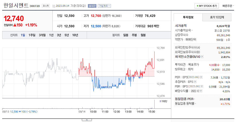 이 글에서는 한일시멘트 주가 전망과 목표 주가, 기업 정보에 대해서 설명합니다. 주식 시장에서 중요한 것은 미래의 기업 가치를 예측하고 선제적으로 움직이는 것입니다. 투자할 종목을 고르기 전에 현재 기업의 현황과 데이터를 확인하는 것이 필요합니다. 한일시멘트 주식의 주요 현황과 투자 정보를 확인하시고 주식 투자에 도움이 될 만한 정보들을 모아 놓았으니 투자 시 참고하시기 바랍니다..