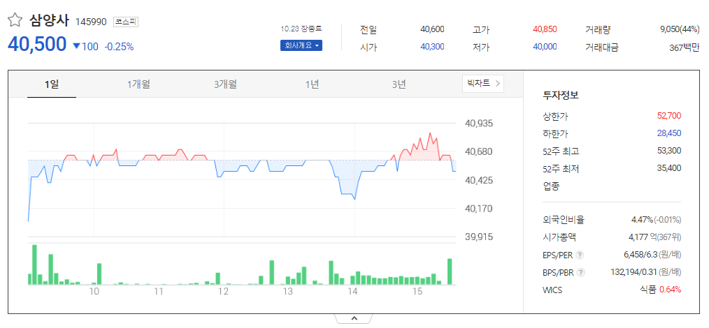 삼양사 현재 주가는 40,600원이며 전일 대비 -750원의 모습을 보이고 있습니다. 삼양사의 주주현황을 살펴보면 삼양홀딩스(외 9인)이 지분 64.14%를 소유하고 있습니다. 삼양사는 식료품 기업으로 장중 기준으로 주가는 40,600원 입니다. 시가 총액은 4192억 원이며 발행 주식수는 4.47주 입니다. 외국인 보유 비중은 20,493% 이며 장중 거래량은 10,313,449를 기록했습니다. 매출액은 13,509억 원, 영업이익은 820억 원을 달성했습니다. 삼양사 주식 배당수익률은 3.24% 입니다.