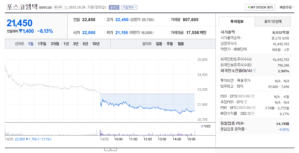 포스코엠텍 현재 주가는 22,850원이며 전일 대비 -1,750원의 모습을 보이고 있습니다. 포스코엠텍의 주주현황을 살펴보면 포스코(외 1인)이 지분 50.65%를 소유하고 있습니다. 포스코엠텍는 금속 및 광물 기업으로 장중 기준으로 주가는 22,850원 입니다.시가 총액은 8953억 원이며 발행 주식수는 1.90주 입니다. 외국인 보유 비중은 788,467% 이며 장중 거래량은 41,642,703를 기록했습니다. 매출액은 1,668억 원, 영업이익은 64억 원을 달성했습니다. 포스코엠텍 주식 배당수익률은 3,759,752% 입니다.