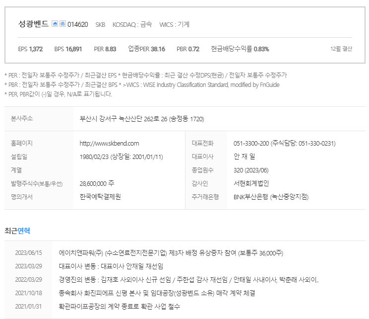 성광벤드는 기계 기업입니다. 대표자는 안재일 이며 설립일은 1980/02/23, 주식 상장일은 2001/01/11입니다. 전체 종업원 수는320명 이고 본사 주소는 부산시 강서구 녹산산단 262로 26입니다.