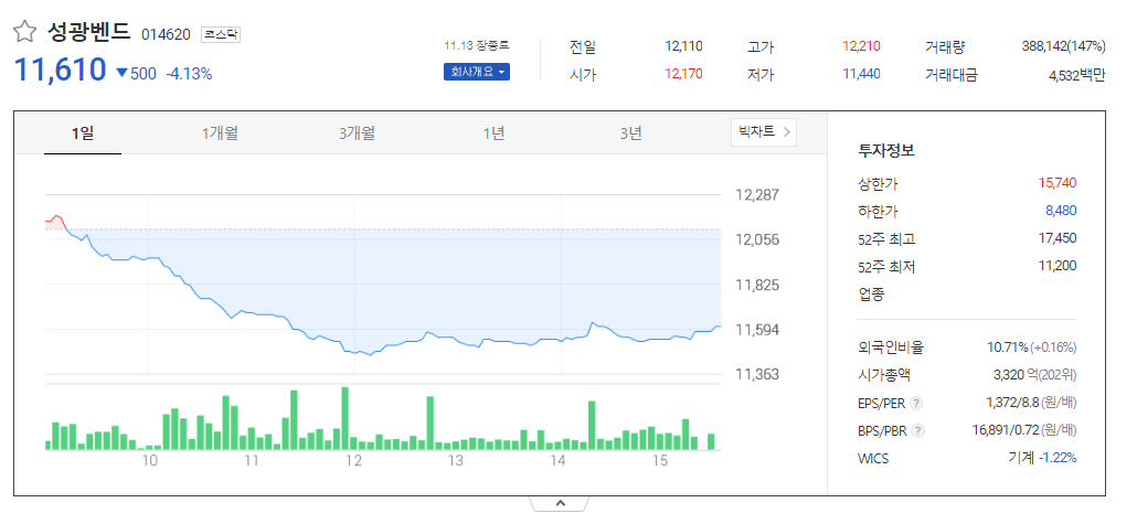 성광벤드 현재 주가는 12,110원이며 전일 대비 -12.81원의 모습을 보이고 있습니다. 성광벤드의 주주현황을 살펴보면 안재일(외 4인)이 지분 35.62%를 소유하고 있습니다. 성광벤드는 기계 기업으로 장중 기준으로 주가는 12,110원 입니다. 성광벤드 시가 총액은 3320억 원이며 발행 주식수는 10.71주 입니다. 외국인 보유 비중은 263,870% 이며 장중 거래량은 28,600,000를 기록했습니다. 매출액은 1,336억 원, 영업이익은 268억 원을 달성했습니다. EPS는 1,651원이며 성광벤드 주식 배당수익률은 0.96% 입니다.