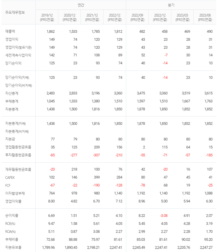 -2023년 6월 전년동기 대비 연결기준 매출액은 10.1% 증가, 영업이익은 6.7% 감소, 당기순이익은 31.9% 감소. 동사는 전년 동기 대비하여 매출액은 증가하였으나 원가율 악화로 영업이익은 소폭 감소했으며, 다른 영업외 이익 지표도 감소하면서 당기순이익은 큰 폭으로 감소함. 동사는 50여년간의 불소수지 가공기술을 활용하여 수소연료전지 부품 제조를 위한 기술을 확보하여 양산을 진행하고 있음.