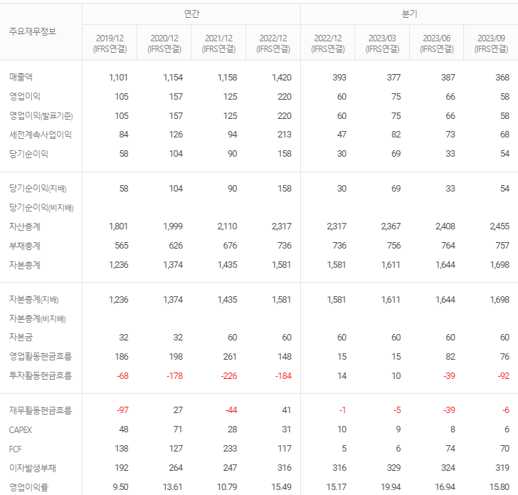 -2023년 6월 전년동기 대비 연결기준 매출액은 11.5% 증가, 영업이익은 36% 증가, 당기순이익은 24.2% 증가. 동사는 매출액이 크게 증가하면서, 각종 비용 상승세를 상쇄했고, 이 효과로 영업이익도 함께 증가함. 국내 환경의 변화로 조제약국의 자동화 비중에 대한 수요가 지속적으로 증가하고 있으며, 1인 약국까지 수요가 지속적으로 증가할 것으로 예상됨.
