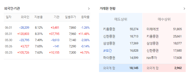 물론 가장 좋은 것은 기관과 외국인 모두 매수하는 쌍끌이 종목을 살펴보는 것입니다. 외국인과 기관이 동시에 매수한다는 뜻은 좋은 종목이라는 것을 의미합니다. 해당 종목의 주가 전망을 분석하기 위해서는 기업체를 우선 분석하고 시장에서 어떤 상태인지 파악해야 합니다. 그리고 기관과 외국인 매수 흐름을 확인한다면 투자 성공 확률을 올리는 것이 가능합니다.