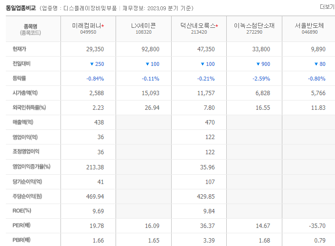 미래컴퍼니 현재 주가는 29,600원이며 전일 대비 -25.16원의 모습을 보이고 있습니다. 미래컴퍼니의 주주현황을 살펴보면 김준구(외 2인)이 지분 26.78%를 소유하고 있습니다. 미래컴퍼니는 디스플레이 및 관련부품 기업으로 장중 기준으로 주가는 29,600원 입니다. 미래컴퍼니 시가 총액은 2588억 원이며 발행 주식수는 2.23주 입니다. 외국인 보유 비중은 52,808% 이며 장중 거래량은 8,817,884를 기록했습니다. 매출액은 958억 원, 영업이익은 255억 원을 달성했습니다. 미래컴퍼니 주식 배당수익률은 0.65% 입니다.