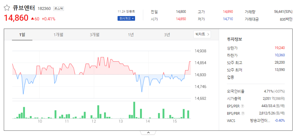 큐브엔터 현재 주가는 14,800원이며 전일 대비 -140원의 모습을 보이고 있습니다. 큐브엔터의 주주현황을 살펴보면 브이티(외 3인)이 지분 50.64%를 소유하고 있습니다. 큐브엔터는 미디어 기업으로 장중 기준으로 주가는 14,800원 입니다. 큐브엔터 시가 총액은 2040억 원이며 발행 주식수는 4.71주 입니다. 외국인 보유 비중은 104,925% 이며 장중 거래량은 13,804,687를 기록했습니다. 매출액은 1,058억 원, 영업이익은 69억 원을 달성했습니다. 큐브엔터 주식 배당수익률은 1.10% 입니다.