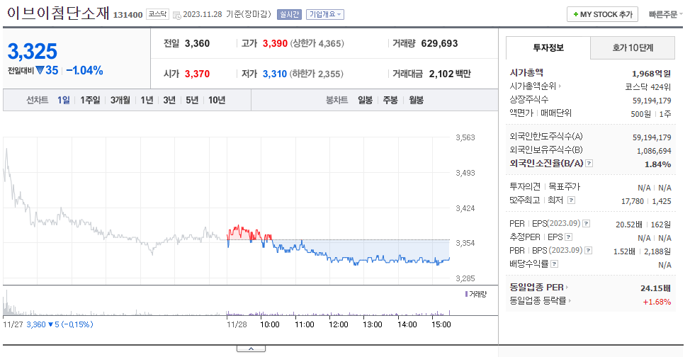 이브이첨단소재 현재 주가는 3,360원이며 전일 대비 -5원의 모습을 보이고 있습니다. 이브이첨단소재의 주주현황을 살펴보면 이 지분 17.42%를 소유하고 있습니다. 이브이첨단소재는 전자 장비 및 기기 기업으로 장중 기준으로 주가는 3,360원 입니다. 이브이첨단소재 시가 총액은 1968억 원이며 발행 주식수는 1.84주 입니다. 외국인 보유 비중은 1,202,697% 이며 장중 거래량은 59,194,179를 기록했습니다. 매출액은 514억 원, 영업이익은 -29억 원을 달성했습니다. 이브이첨단소재 주식 배당수익률은 23% 입니다.