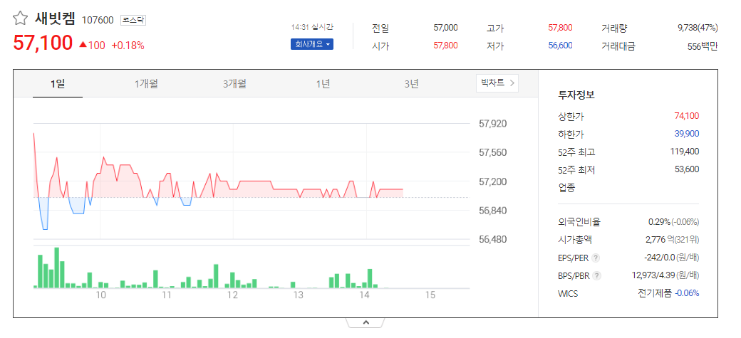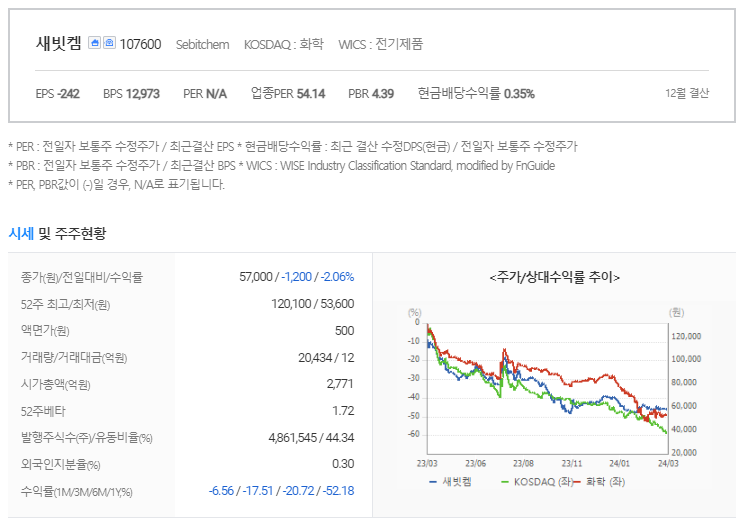 새빗켐 현재 주가는 57,000원이며 전일 대비 -1,200원의 모습을 보이고 있습니다. 새빗켐의 주주현황을 살펴보면 박용진 주주가 전체 지분 55.52%를 소유하고 있습니다. 새빗켐는 전자 장비 및 기기 기업으로 장중 기준으로 주가는 57,000원 입니다. 새빗켐의 시가 총액은 2776억 원이며 발행 주식수는 4,861,545주 입니다. 외국인 보유 비중은 0.29% 이며 장중 거래량은 20,434원 을 기록했습니다. 매출액은 460억 원을 달성했습니다. EPS는 없음원이며 새빗켐 주식 배당수익률은 1,341.53% 입니다.