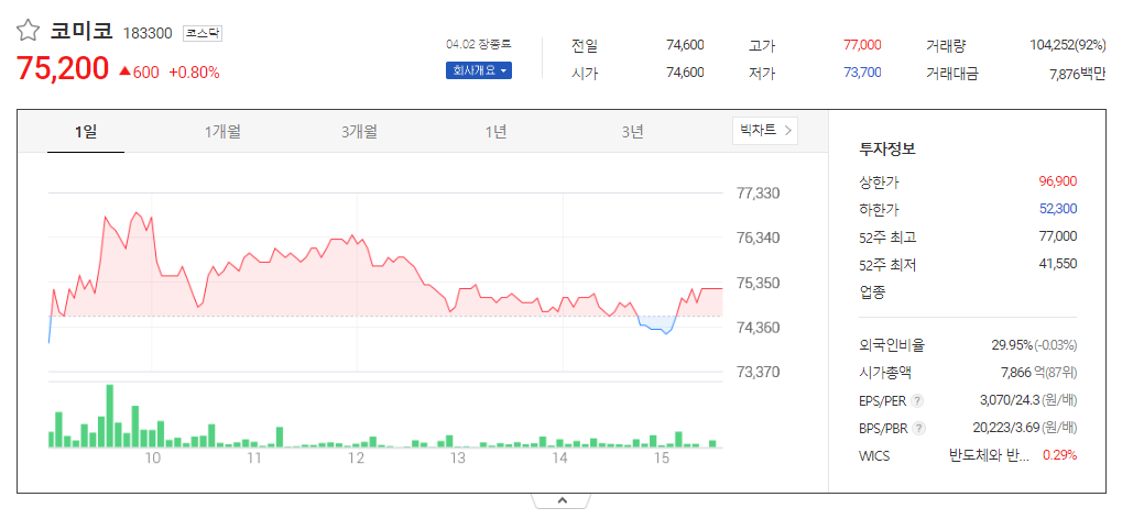코미코 현재 주가는 74,600원이며 전일 대비 원의 모습을 보이고 있습니다. 코미코의 주주현황을 살펴보면 미코 주주가 전체 지분 41.10%를 소유하고 있습니다. 코미코는 반도체 및 관련장비 기업으로 장중 기준으로 주가는 74,600원 입니다. 코미코의 시가 총액은 7866억 원이며 발행 주식수는 10,460,684주 입니다. 외국인 보유 비중은 29.95% 이며 장중 거래량은 112,358원 을 기록했습니다. 매출액은 3,073억 원을 달성했습니다. EPS는 4,206원이며 코미코 주식 배당수익률은 0.72% 입니다.