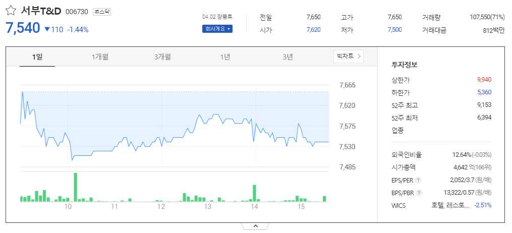 서부T&D 현재 주가는 7,650원이며 전일 대비 원의 모습을 보이고 있습니다. 서부T&D의 주주현황을 살펴보면 엠와이에이치 주주가 전체 지분 51.84%를 소유하고 있습니다. 서부T&D는 호텔 및 레저 기업으로 장중 기준으로 주가는 7,650원 입니다. 서부T&D의 시가 총액은 4642억 원이며 발행 주식수는 67,426,923주 입니다. 외국인 보유 비중은 12.64% 이며 장중 거래량은 151,142원 을 기록했습니다. 매출액은 1,692억 원을 달성했습니다. 서부T&D 주식 배당수익률은 4,323,228% 입니다.