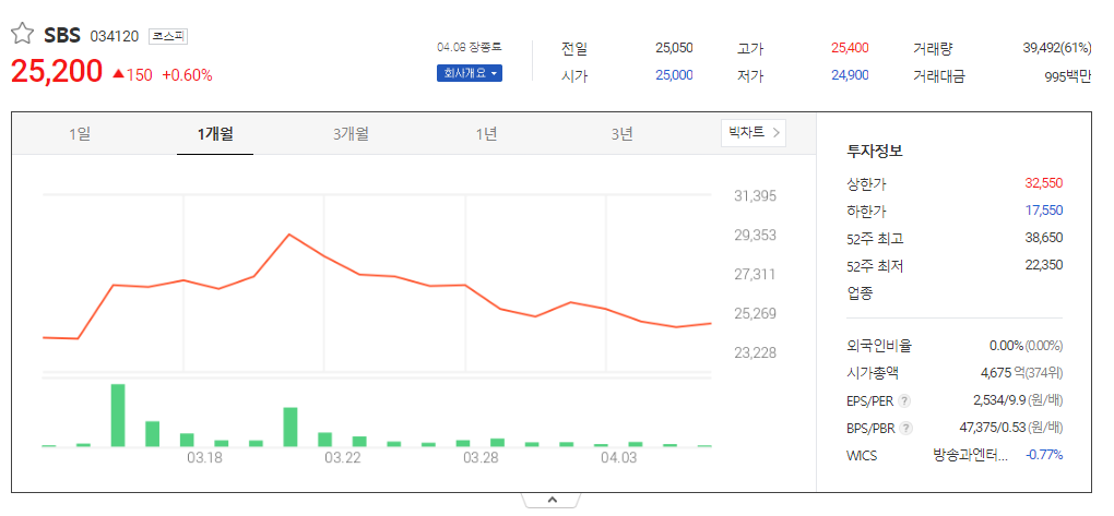 SBS 현재 주가는 25,050원이며 전일 대비 -300원의 모습을 보이고 있습니다. SBS의 주주현황을 살펴보면 티와이홀딩스 주주가 전체 지분 36.32%를 소유하고 있습니다. SBS는 미디어 기업으로 장중 기준으로 주가는 25,050원 입니다. SBS의 시가 총액은 4666억 원이며 발행 주식수는 18,551,238주 입니다. 외국인 보유 비중은 0.00% 이며 장중 거래량은 64,580원 을 기록했습니다. 매출액은 9,968억 원을 달성했습니다. EPS는 2,610원이며 SBS 주식 배당수익률은 4,647% 입니다.