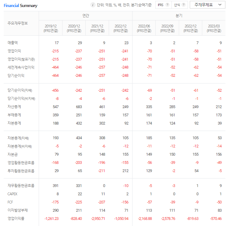 -2022년 12월 전년동기 대비 연결기준 매출액은 169.5% 증가, 영업손실은 4% 감소, 당기순손실은 3.8% 감소. 동사의 수익모델은 내부 개발 중인 신약개발 프로그램을 파트너 제약사에 기술수출하는 모델과 Target X 프로젝트가 있음. 동사가 자체적으로 모델케이스로 운용하고 있는 신약개발 프로그램들은 일정 임상 단계에서 POC 후 조기 기술 수출을 목적으로 하고 있음.
