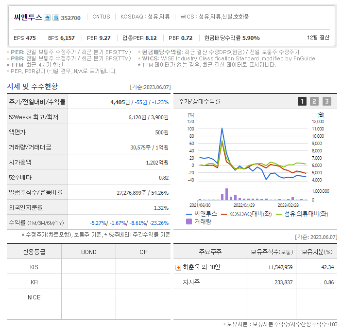 씨앤투스 현재 주가는 4,405원이며 전일 대비 -55원의 모습을 보이고 있습니다. 씨앤투스의 주주현황을 살펴보면 하춘욱(외 10인)이 지분 42.34%를 소유하고 있습니다. 씨앤투스는 섬유 및 의복 기업으로 장중 기준으로 주가는 4,405원 입니다. 삼성전자의 시가 총액은 1197억 원이며 발행 주식수는 1.32주 입니다. 외국인 보유 비중은 30,575% 이며 장중 거래량은 27,276,899를 기록했습니다. 매출액은 240억 원, 영업이익은 267억 원을 달성했습니다. EPS는 없음원이며 씨앤투스 주식 배당수익률은 3.32% 입니다.