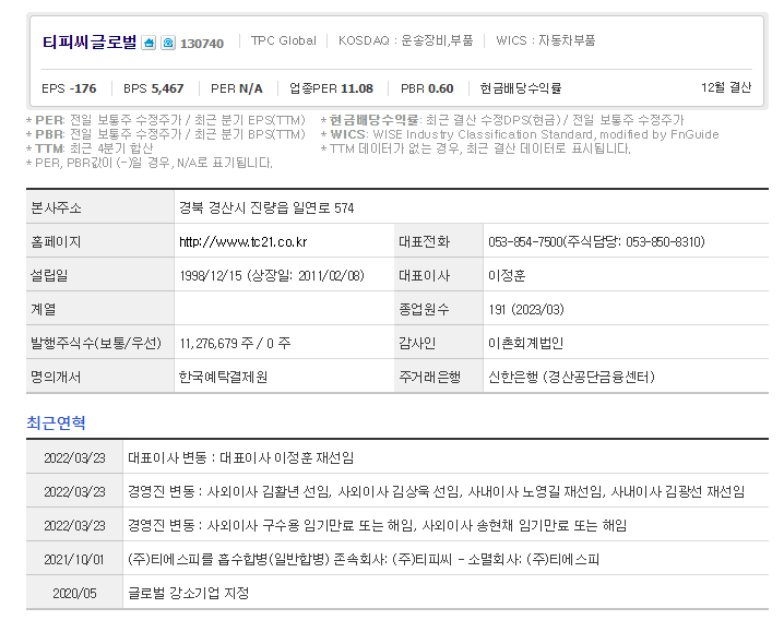 티피씨글로벌는 자동차부품 기업입니다. 대표자는 이정훈 이며 설립일은 1999/01/01, 주식 상장일은 2011/02/08입니다. 전체 종업원 수는196명 이고 본사 주소는 경북 경산시 진량읍 일연로 574입니다.