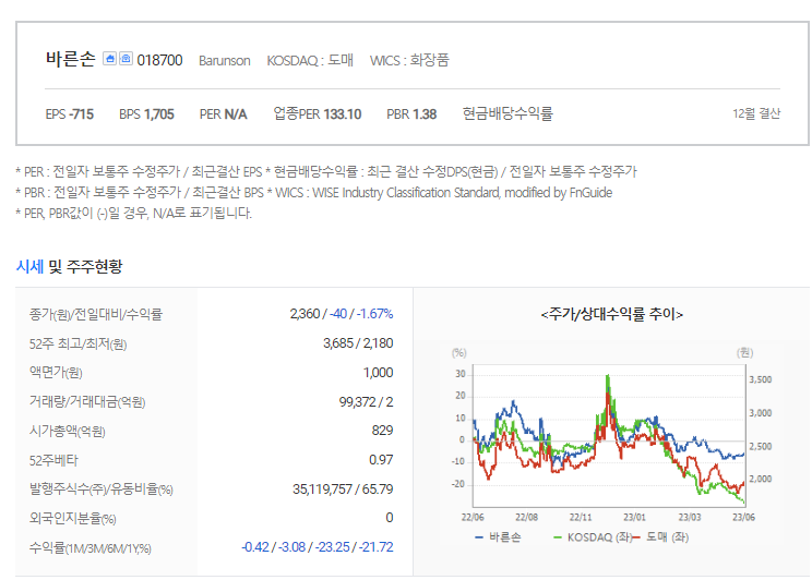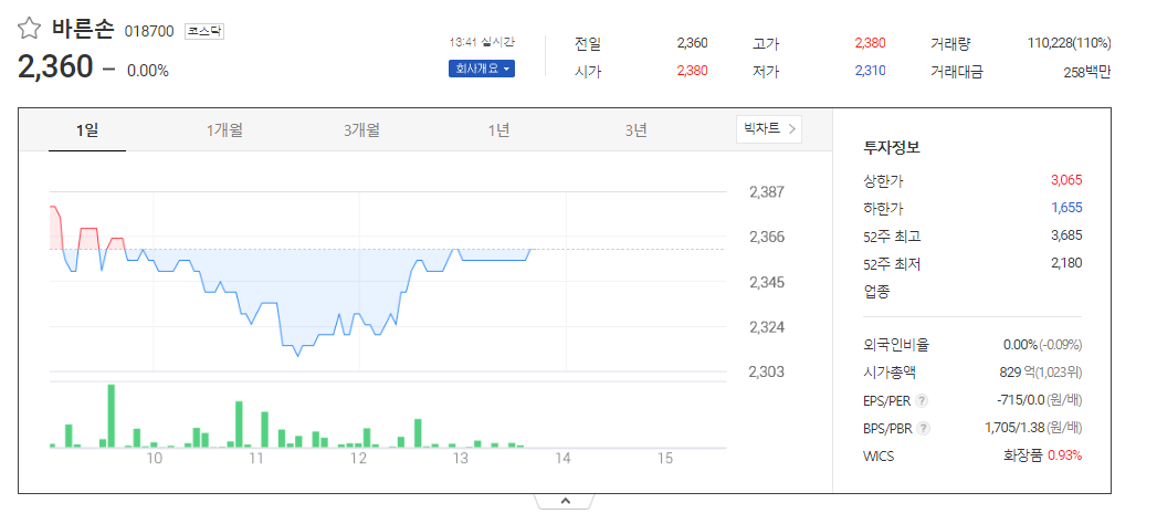 바른손 현재 주가는 2,360원이며 전일 대비 -40원의 모습을 보이고 있습니다. 바른손의 주주현황을 살펴보면 바른손이앤에이(외 4인)이 지분 32.24%를 소유하고 있습니다. 바른손는 개인생활용품 기업으로 장중 기준으로 주가는 2,360원 입니다. 삼성전자의 시가 총액은 827억 원이며 발행 주식수는 0.00주 입니다. 외국인 보유 비중은 99,372% 이며 장중 거래량은 35,119,757를 기록했습니다. 매출액은 140억 원, 영업이익은 -52억 원을 달성했습니다. EPS는 없음원이며 바른손 주식 배당수익률은 -11% 입니다.
