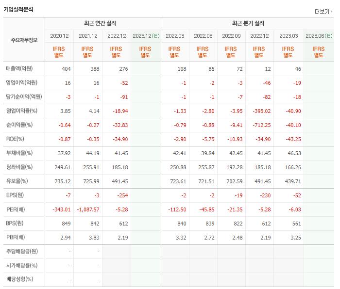 -2022년 12월 전년동기 대비 별도기준 매출액은 28.9% 감소, 영업이익 적자전환, 당기순손실은 8,451.9% 증가. 동사 매출은 전년 동기 대비 다소 감소했으며 매출감소에 다른 매출원가 부담은 줄었지만 판관비와 인건비 등 각종 비용 부담이 늘어나면서 영업이익은 전년 동기 대비 적자전환함. 영업손실 전환과 함께 법인세 비용 부담 가중으로 당기순손실은 전년 동기 대비 대폭 확대됨.