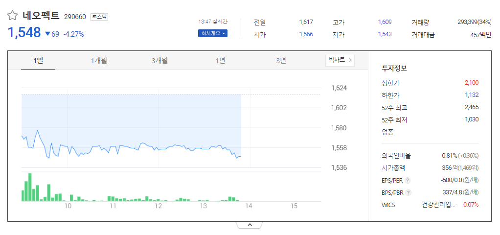 이 글에서는 네오펙트 주가 전망과 목표 주가, 기업 정보에 대해서 설명합니다. 주식에 투자하기 전에는 기업 현황고 현재 시장 흐름에 대해서 살펴보는 것이 필요합니다. 네오펙트 주식의 주요 현황과 투자 정보를 확인하시고 현재 시장 현황을 살펴보겠습니다.