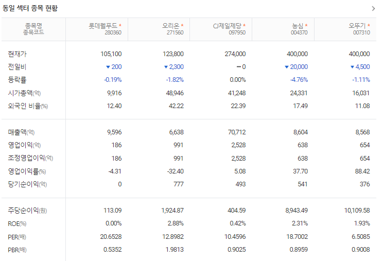롯데웰푸드 현재 주가는 105,300원이며 전일 대비 -400원의 모습을 보이고 있습니다. 롯데웰푸드의 주주현황을 살펴보면 롯데지주(외 16인)이 지분 70.14%를 소유하고 있습니다. 롯데웰푸드는 식료품 기업으로 장중 기준으로 주가는 105,300원 입니다. 삼성전자의 시가 총액은 9916억 원이며 발행 주식수는 12.41주 입니다. 외국인 보유 비중은 10,184% 이며 장중 거래량은 9,434,574를 기록했습니다. 매출액은 9,596억 원, 영업이익은 1,124억 원을 달성했습니다. EPS는 10,419원이며 롯데웰푸드 주식 배당수익률은 1.88% 입니다.