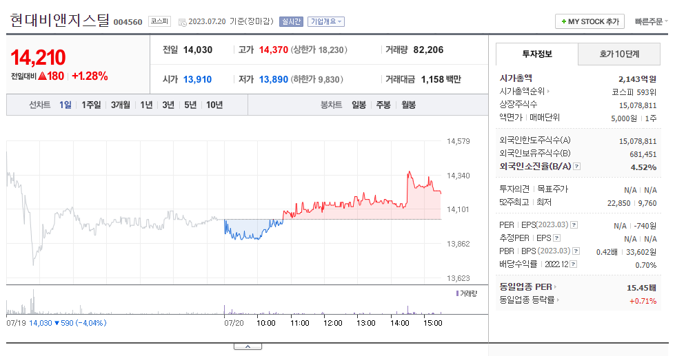 이 글에서는 현대비앤지스틸 주가 전망과 목표 주가, 기업 정보에 대해서 설명합니다. 주식 투자를 하려면 기업 주가와 재무 현황표에 대해서 분석하는 것이 필요합니다. 현대비앤지스틸 주식의 주요 현황과 투자 정보를 확인하시고 주가 흐름을 파악해보겠습니다.