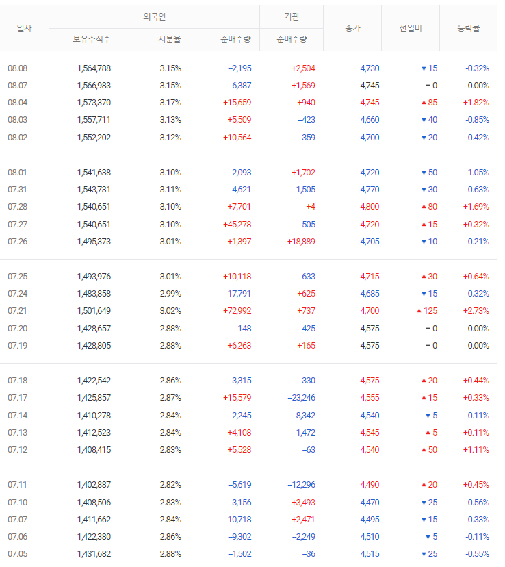 만약 짧은 기간 거래를 지향한다면 주주현황 정보는 필요 없겠지만 긴 관점에서 기업의 가치를 알아보고 분석할 때는 경영진의 비전과 능력을 보는 것도 필요합니다. 대주주를 직접 대면할 수는 없지만 어떤 형태로 구성되어 있는지는 살펴보는 것이 좋습니다.
