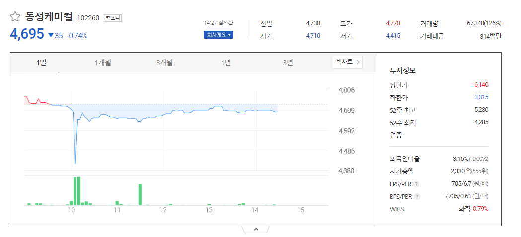 이 글에서는 동성케미컬 주가 전망과 목표 주가, 기업 정보에 대해서 설명합니다. 주식을 시작하기 위해서는 정확한 기업 정보와 주가 현황에 대해 알아보는 것이 필요합니다. 동성케미컬 주식의 주요 현황과 투자 정보를 확인하시고 주가 현황을 시장에 맞춰서 분석해보겠습니다.