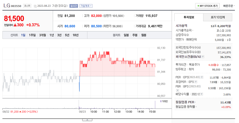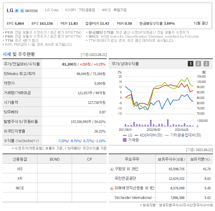 LG 현재 주가는 81,200원이며 전일 대비 -7.20원의 모습을 보이고 있습니다. LG의 주주현황을 살펴보면 구광모(외 29인)이 지분 41.70%를 소유하고 있습니다. LG는 복합 산업 기업으로 장중 기준으로 주가는 81,200원 입니다. 삼성전자의 시가 총액은 12조8200억 원이며 발행 주식수는 36.33주 입니다. 외국인 보유 비중은 121,937% 이며 장중 거래량은 157,300,993를 기록했습니다. 매출액은 16,490억 원, 영업이익은 19,414억 원을 달성했습니다. EPS는 10,325원이며 LG 주식 배당수익률은 3.84% 입니다.